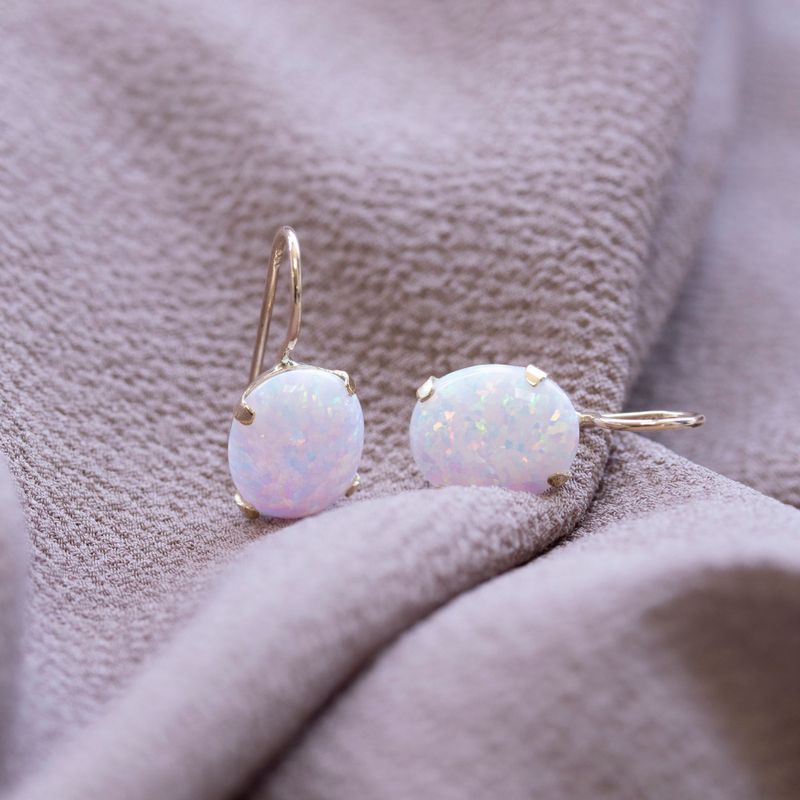 עגילים תלויים מזהב 14 קראט משובצים באבן אופל לבן מלאכותית בצורת אליפסה, מיוצרים בעבודת יד ישראלית
