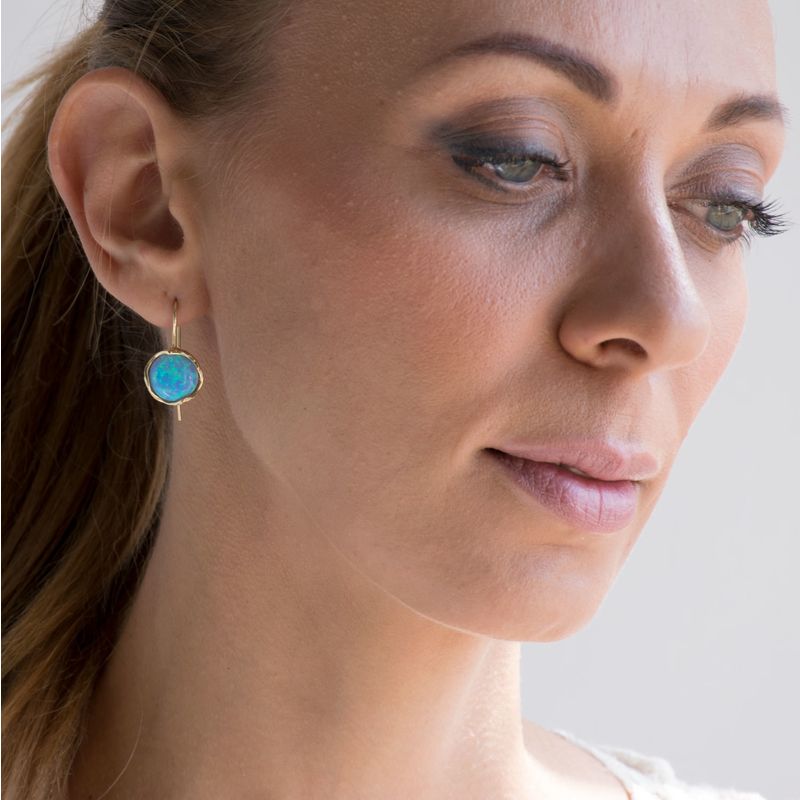 עגילי זהב 14 קראט תלויים בשיבוץ אבן אופל כחולה יפהפיה בעיצוב וינטג'. מעוצב ומיוצר בעבודת יד ישראלית.
