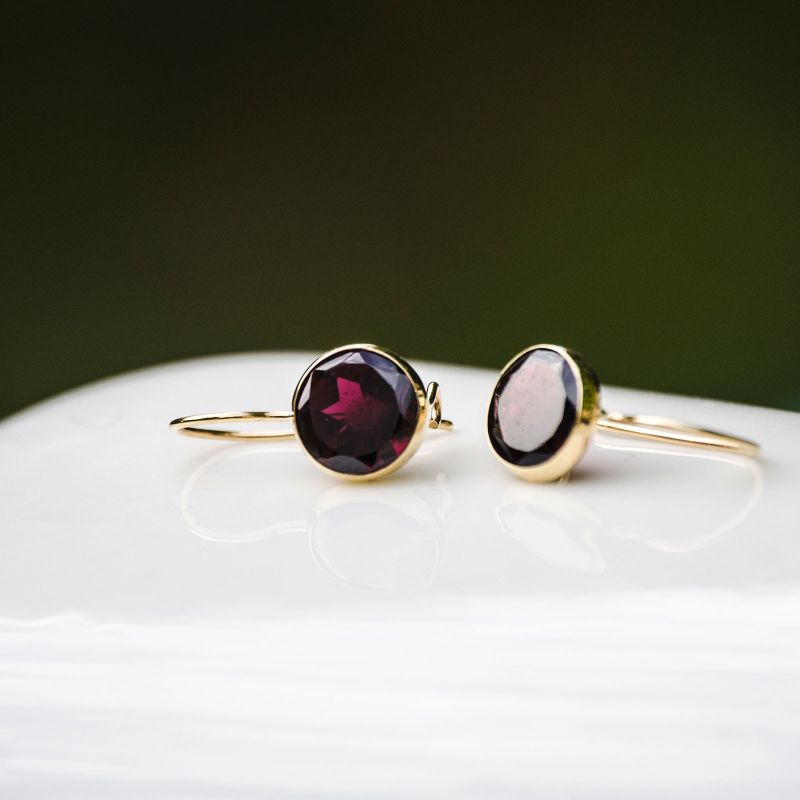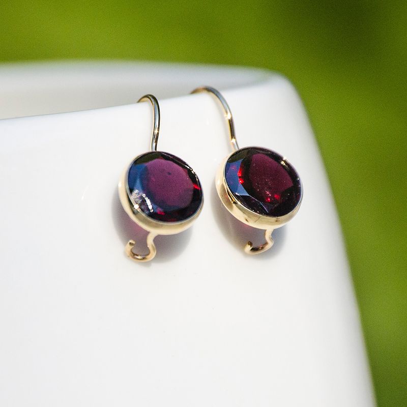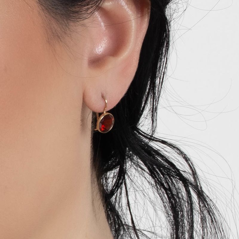 עגילים עדינים בעיצוב תלוי מזהב 14 קראט, משובצים באבן גרנט בורדו בקוטר 8 מ"מ. העגילים מיוצרים בעבודת יד בישראל, ומעניקים מראה ייחודי וססגוני שמתאים לכל הופעה, יומיומית או חגיגית.