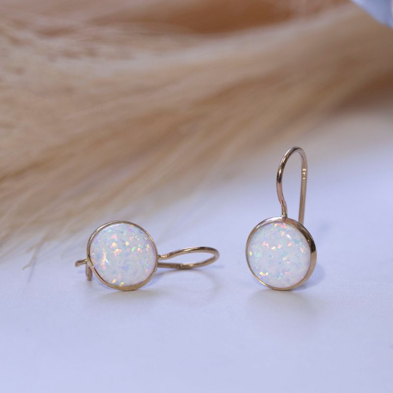 עגילים עדינים מזהב 14 קראט, תלויים ומשובצים באבן אופל לבנה בקוטר 8 מ"מ. העגילים מיוצרים בעבודת יד בישראל, ומשלימים כל הופעה עם מראה ייחודי וססגוני, מושלם ליום יום או לאירועים מיוחדים.