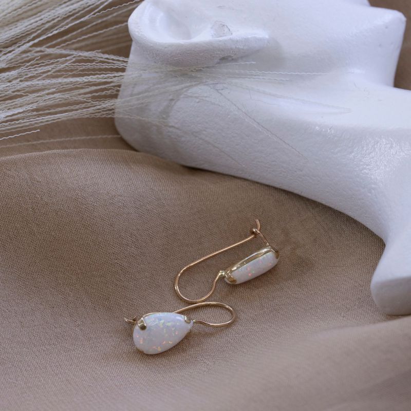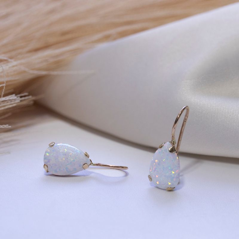 עגילי טיפה זהב 14 קראט עם אופל לבן 7x10 מ״מ
