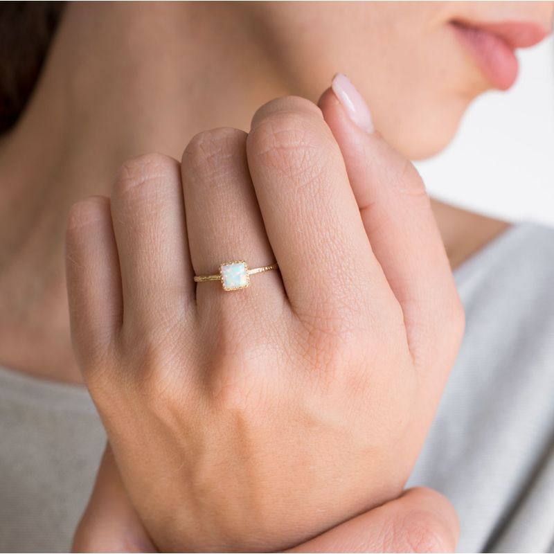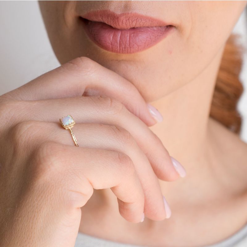 טבעת זהב 14 קראט בשיבוץ אופל לבן מרובע מבית עדיתא גולד