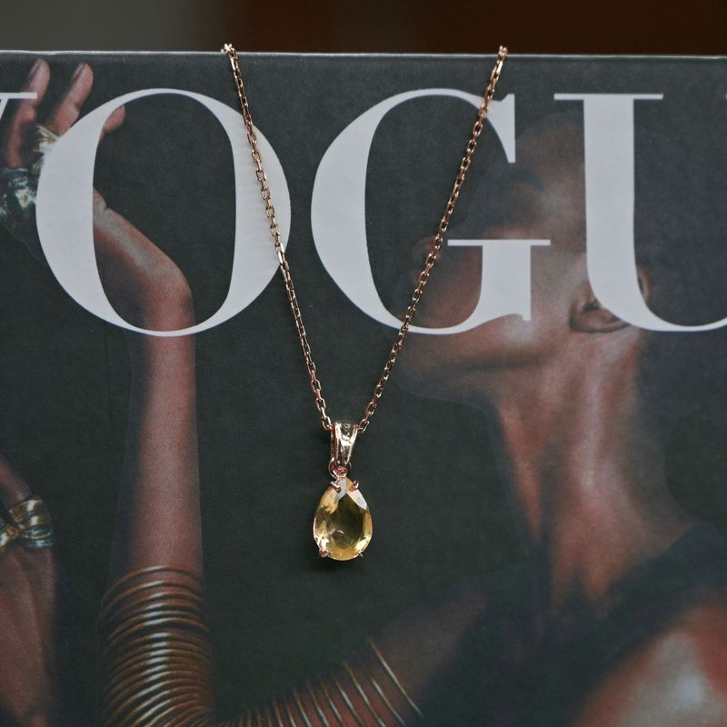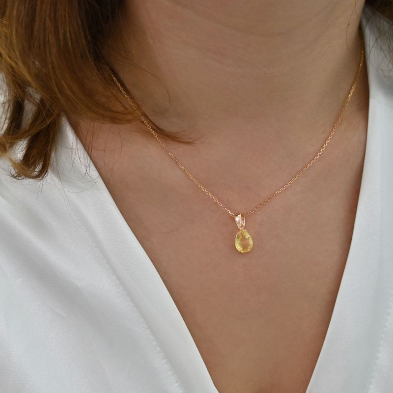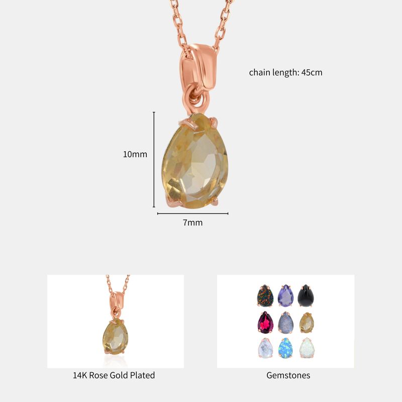 תליון מכסף סטרלינג 925 בציפוי זהב אדום בעיצוב טיפה, עם שיבוץ אבן סיטרין מלאכותי בליטוש פאסט בגודל 7x10 מ"מ. עיצוב אלגנטי עם ברק שמשי ומראה אופטימי. הידעת? סיטרין היא אבן של שפע, שמחה ואנרגיה חיובית.