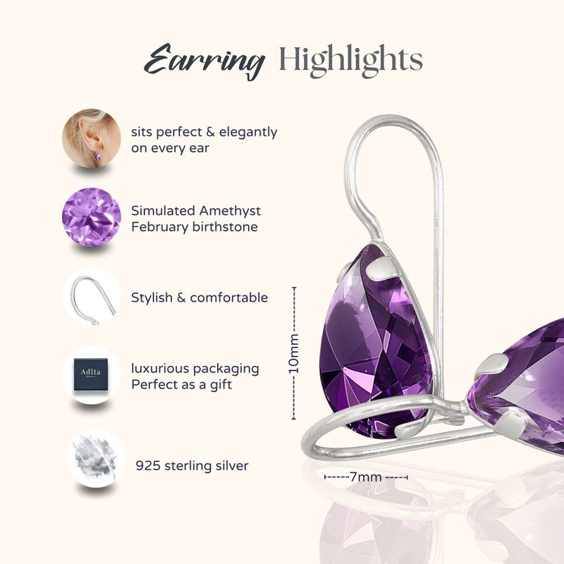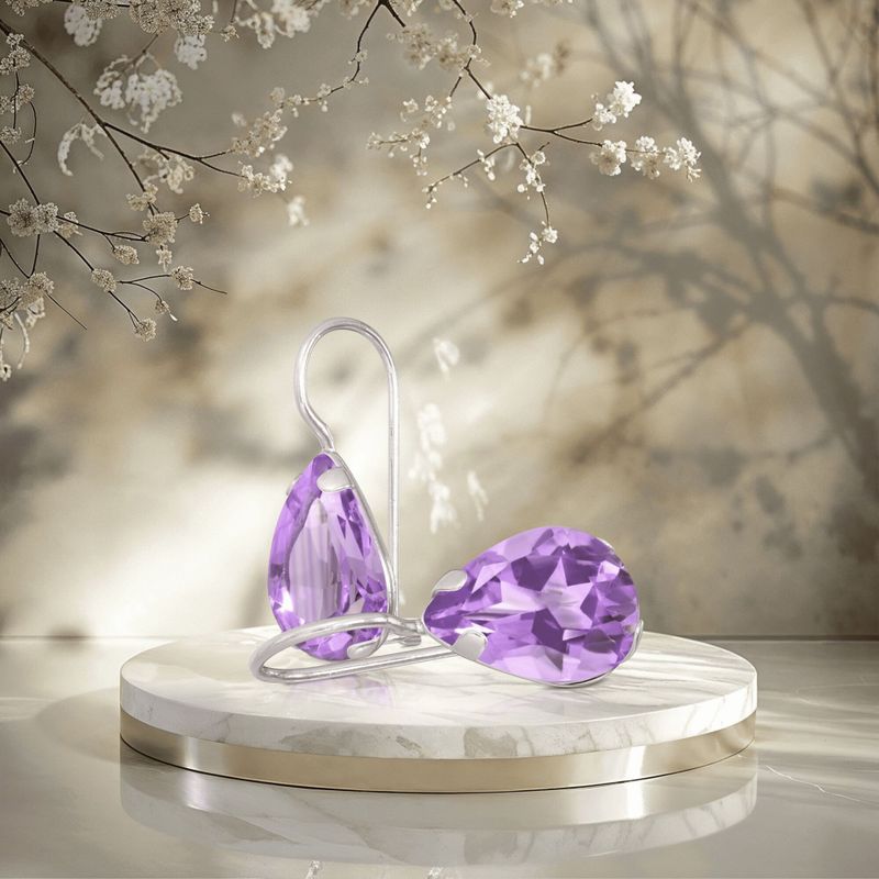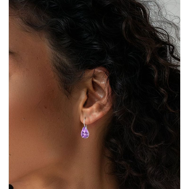 עגילי כסף 925 בעיצוב תלוי עם שיבוץ אבן אמטיסט מלאכותית בגוון סגול, בליטוש פאסט בצורת טיפה. שילוב של אלגנטיות ורוגע. הידעת? אמטיסט היא אבן של ריפוי רגשי, רוגע ואיזון פנימי.