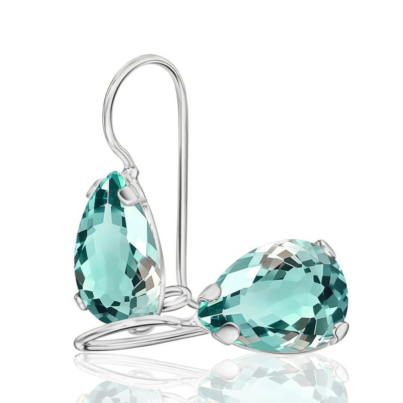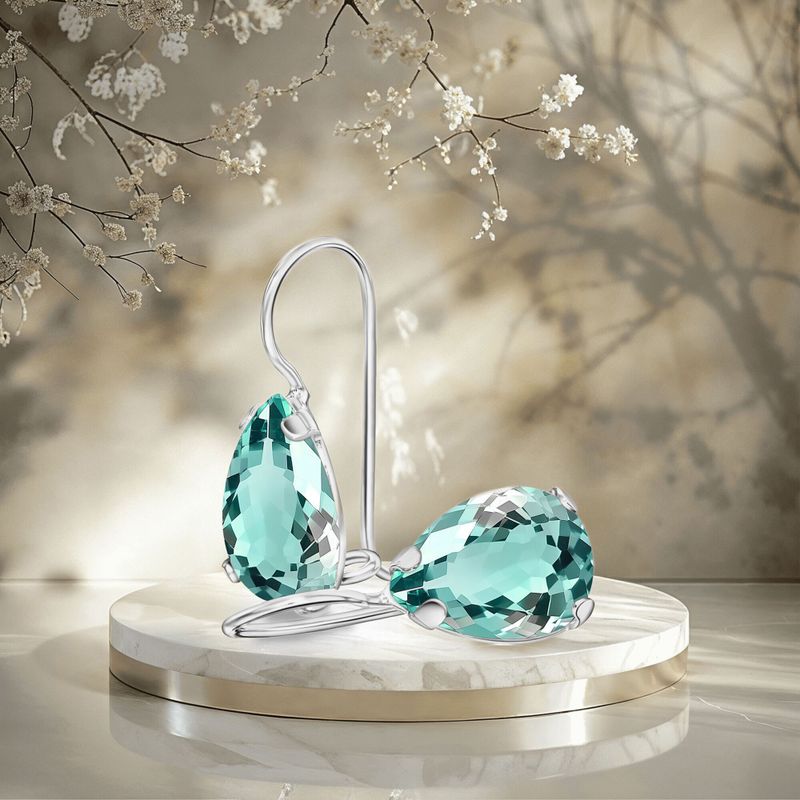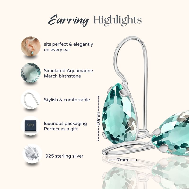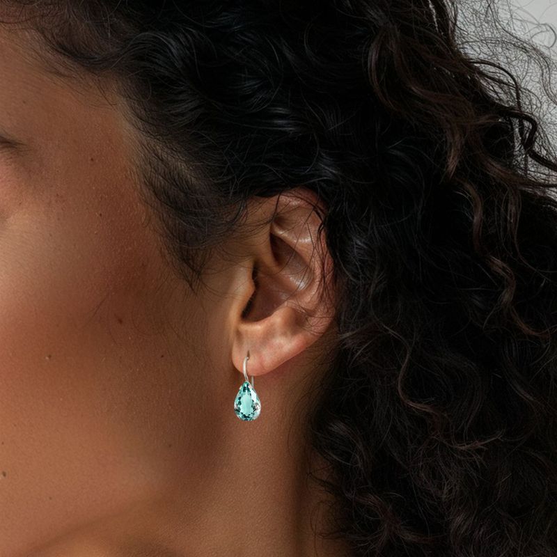 עגילים עם שיבוץ אקוואמרין מלאכותי בגוון תכלת רך בצורת טיפה. מראה רענן ונקי. הידעת? אקוואמרין מעודדת תקשורת פתוחה ורוגע נפשי.