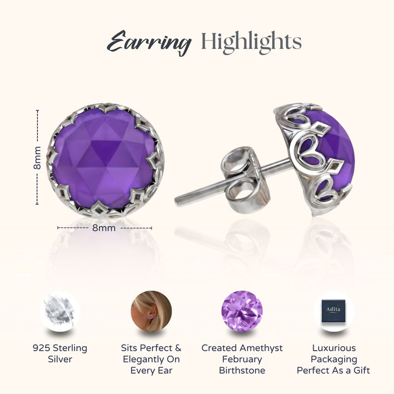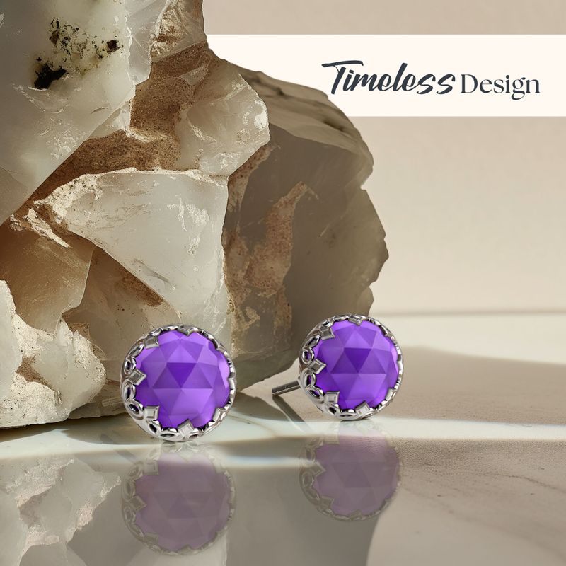 עגילי כסף סטרלינג 925 קלאסיים בעיצוב עגול, משובצים באבן אמטיסט סינתטית בגודל 8 מ"מ.