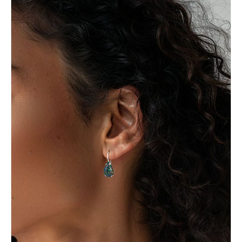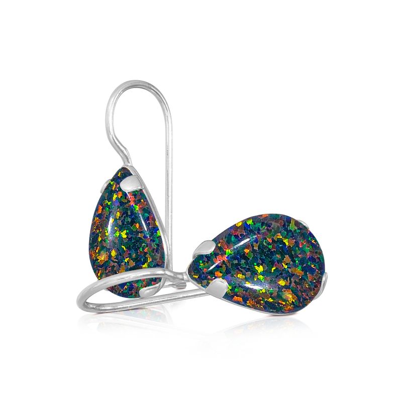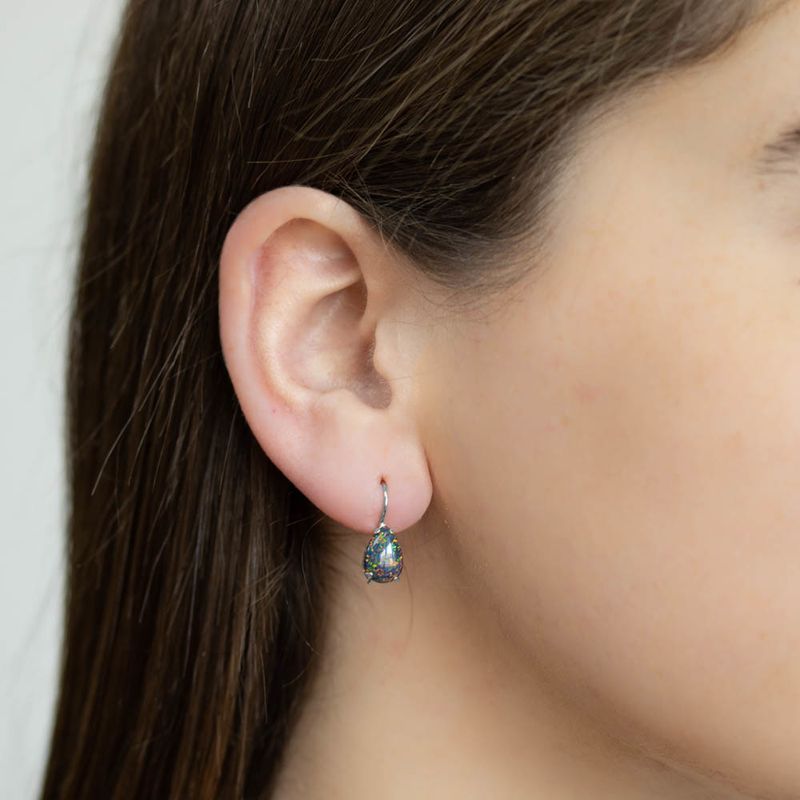 עגילי זהב לבן 14 קראט עם אבן אופל שחור מלאכותי קבושון בצורת טיפה בגודל 7x10 מ"מ. העיצוב האלגנטי משלב עומק צבע עם תנועה עדינה. הידעת? אופל שחור מעודד איזון רגשי, הגנה ועצמאות פנימית.
