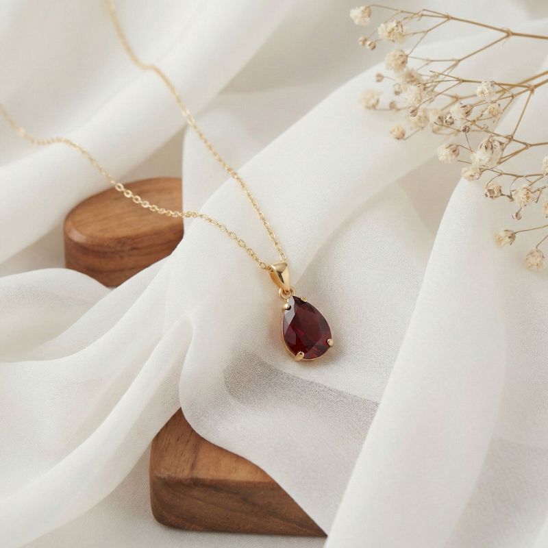 14K Yellow Gold Teaedrop Red Garnet Pendant - Lovely Necklace , Handmade