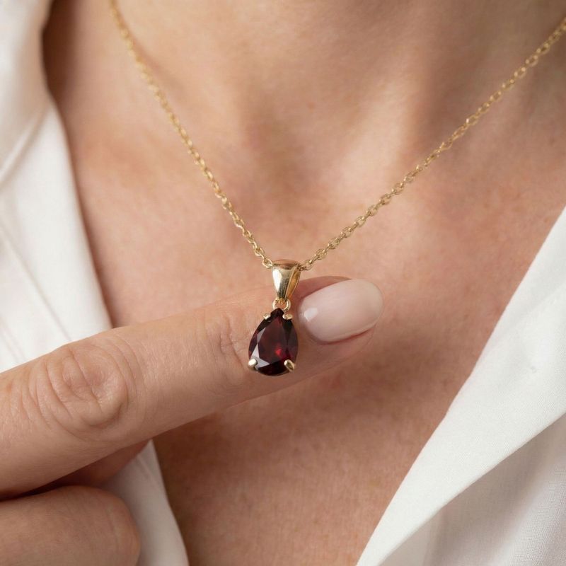 תליון טיפה עשוי זהב 14 קראט, משובץ אבן גרנט בצבע בורדו עמוק ומרהיב. התליון מעוצב ומיוצר בעבודת יד ישראלית מוקפדת, ומשדר מראה קלאסי, עדין ונשי שמשתלב נהדר עם כל הופעה אלגנטית.