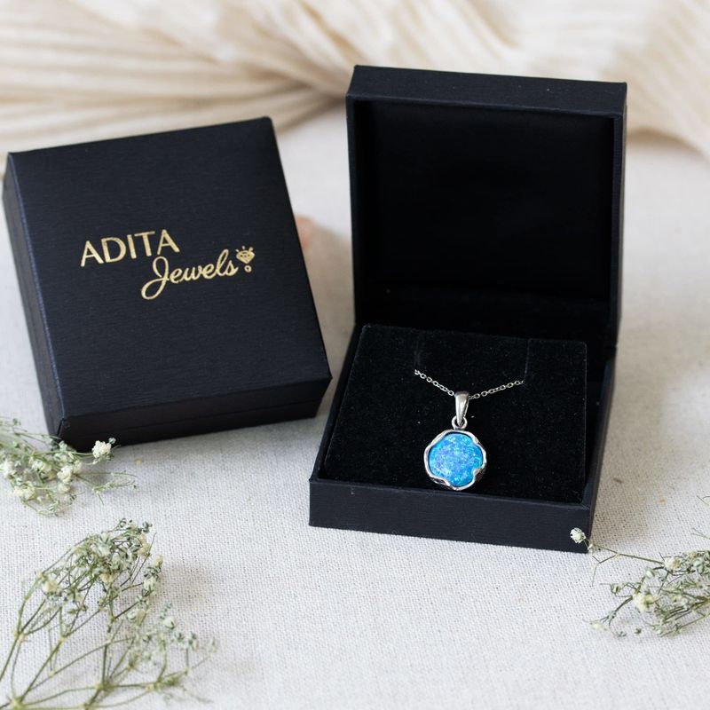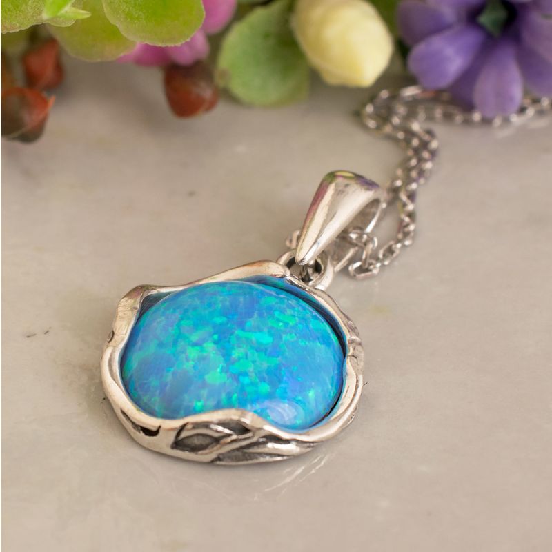 תליון כסף 925 מעוטר בסגנון וינטג', משובץ באבן אופל כחולה ומרהיבה. עיצוב ייחודי בעבודת יד ישראלית