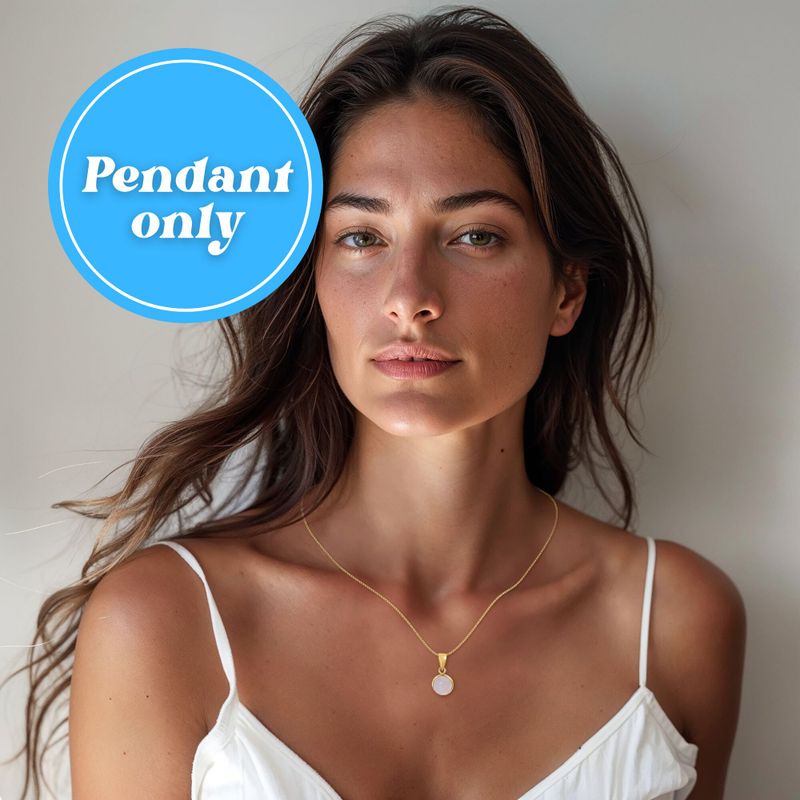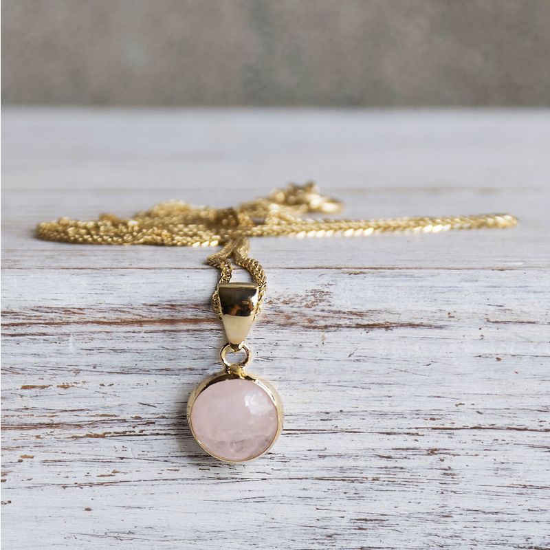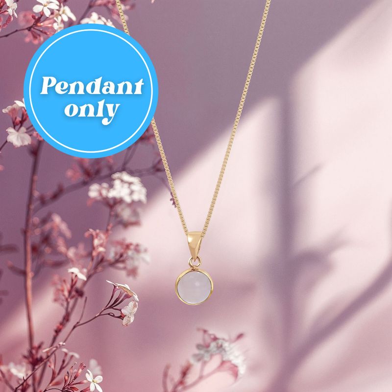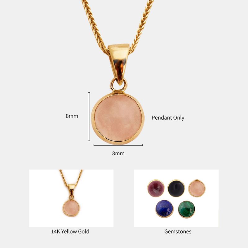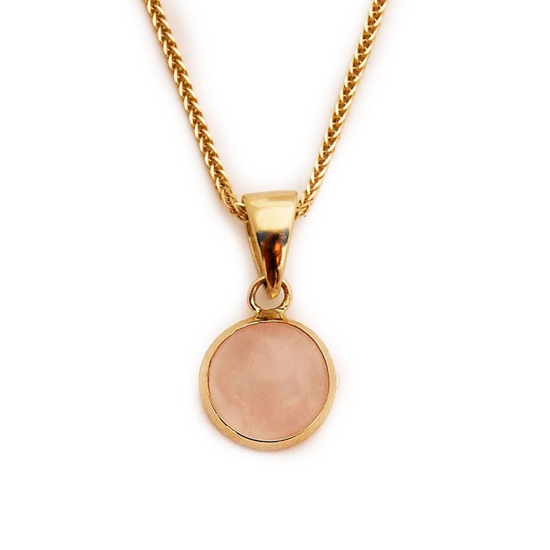 תליון מזהב צהוב 14 קראט עם שיבוץ רוז קוורץ ורדרד בקוטר 8 מ"מ בליטוש קבושון עגול. עיצוב רומנטי ועדין.
