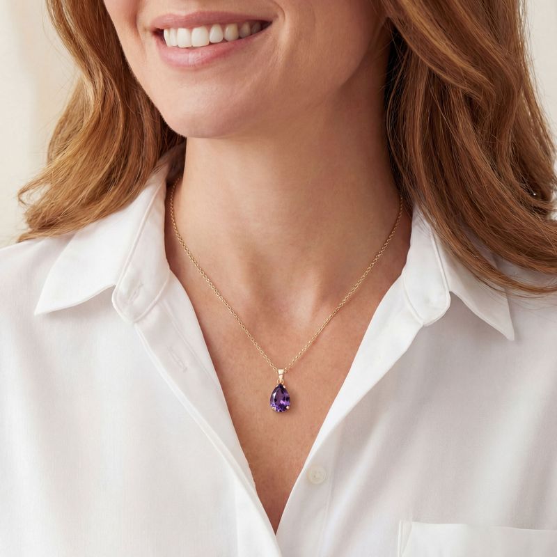 תליון זהב 14 קראט בעיצוב טיפה קלאסי, משובץ אבן אמטיסט בגודל 10*7 מ"מ. התליון מיוצר בעבודת יד ישראלית מוקפדת, ומשדר מראה עדין ונשי שמתאים לכל הופעה אלגנטית ומרשימה.