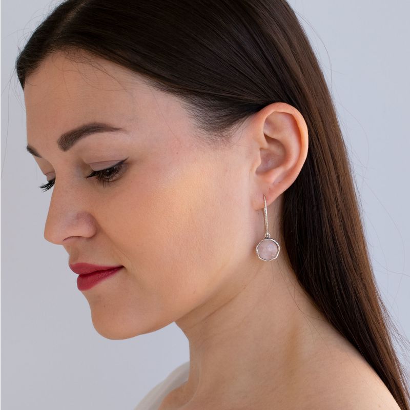 עגילי כסף 925 מעוטרים בסגנון וינטג' בשיבוץ אבני רוז קוורץ ורודות במראה קלאסי. מעוצב ומיוצר בעבודת יד ישראלית. .