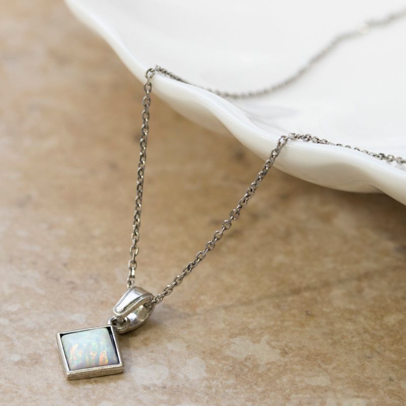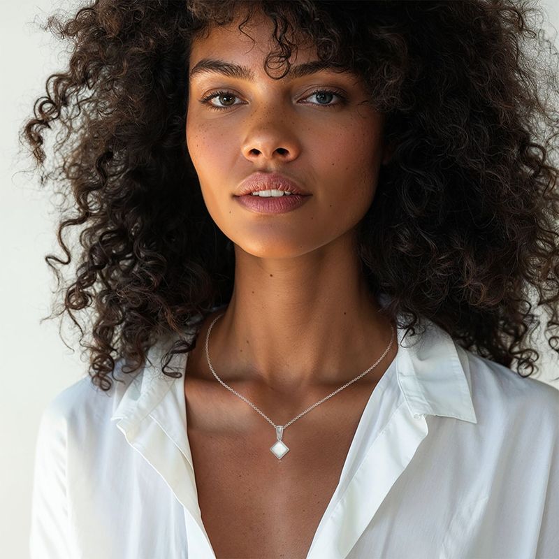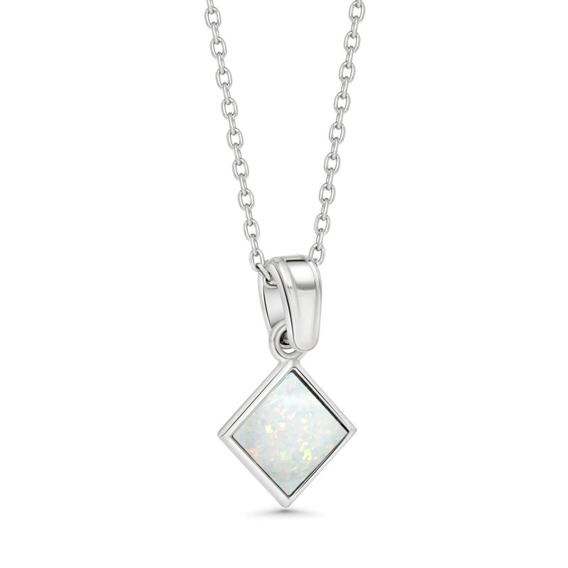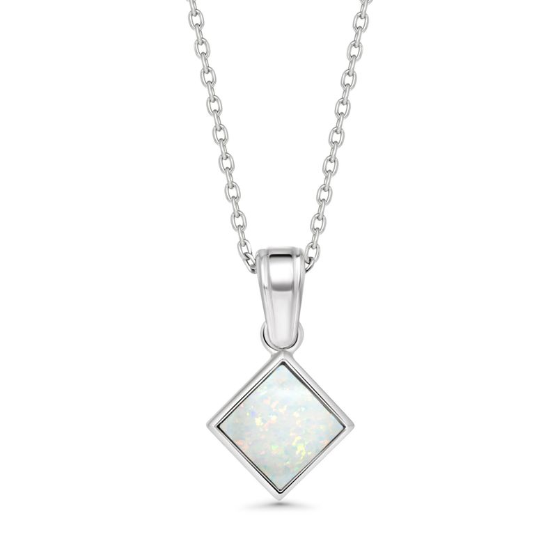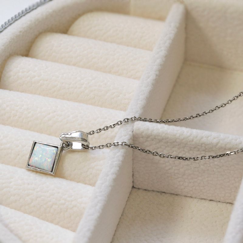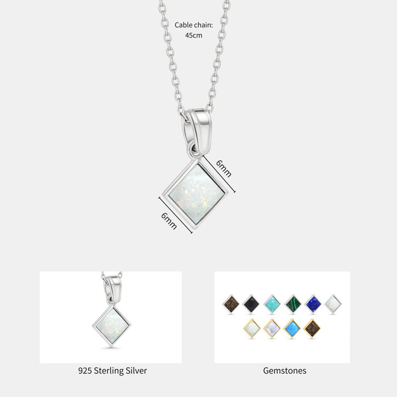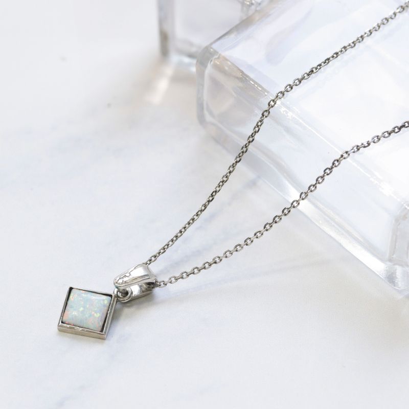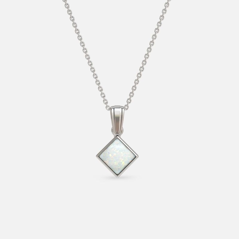 תליון כסף סטרלינג 925 בעיצוב ריבוע עם שיבוץ אופל לבן מלאכותי בגודל 6x6 מ"מ. עדין, מואר ומלא ברק פנימי רך. הידעת? אופל לבן מסמל השראה, איזון ודמיון יצירתי.