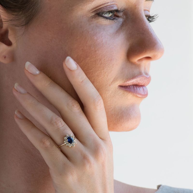 טבעת זהב בעבודת יד קפדנית, בעלת עיצוב קלאסי ונשי המשובצת בזירקון כחול בצורת אובל בגודל 7x5 מ"מ, מוקפת 10 זרקונים קטנים לקבלת מראה נוצץ ומרשים במיוחד.