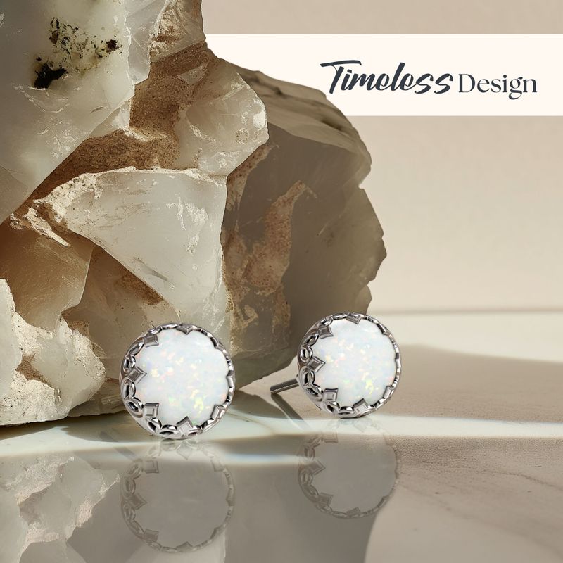 עגילי כסף סטרלינג 925 קלאסיים בעיצוב עגול, משובצים באבן אופל לבן מלאכותי בגודל 8 מ"מ.