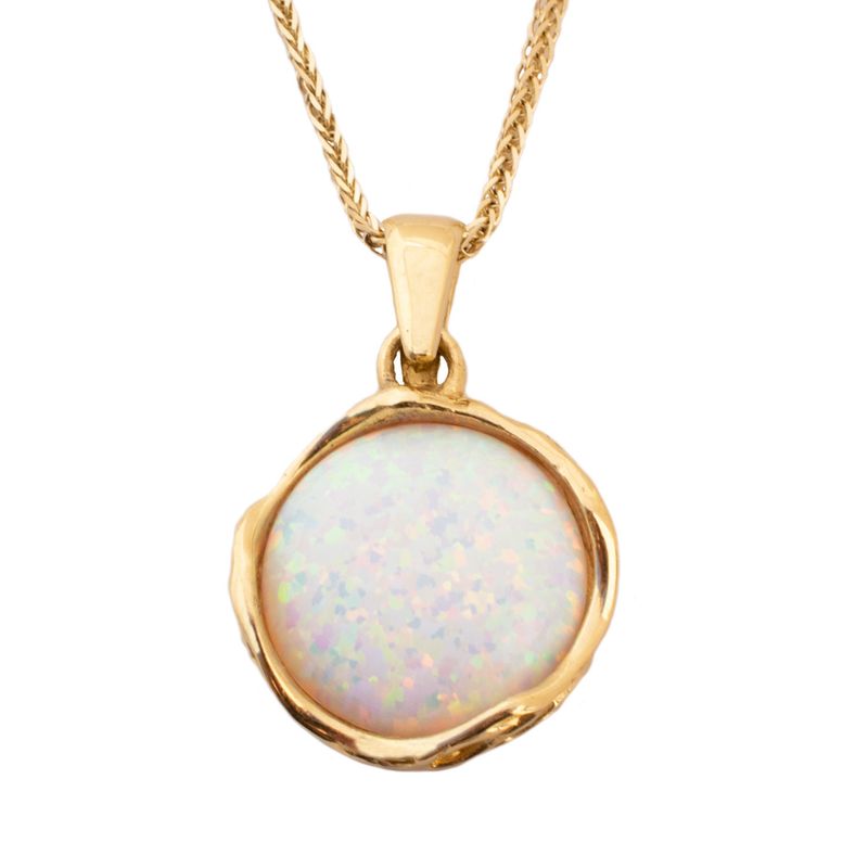 תליון מעוטר, זהב 14 קראט בשיבוץ אבן אופל לבנה בעלת מראה ייחודי. מעוצבת בסגנון קלאסי ובעבודת יד ישראלית
