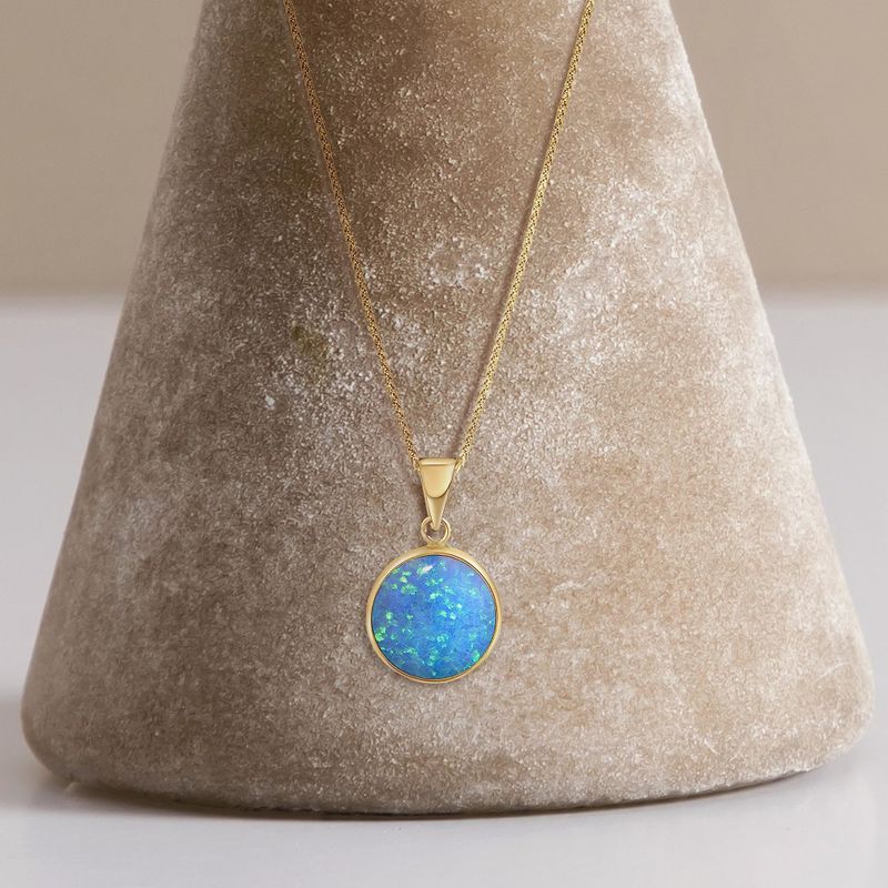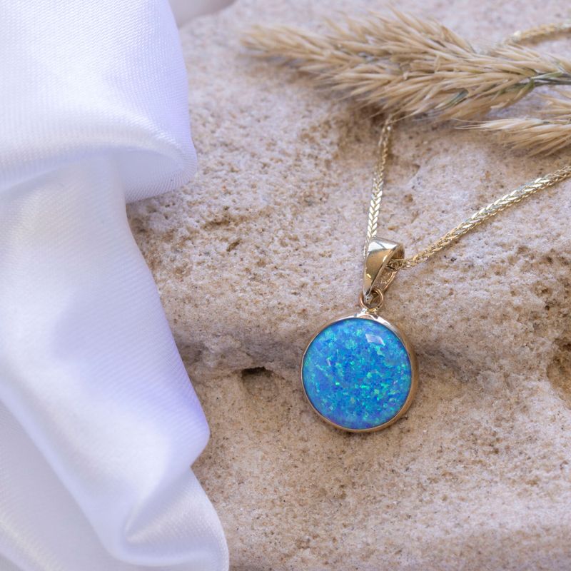 Кулон из настоящего 14-каратного золота с круглым синим опалом. Изготовлено вручную в Израиле, часть выручки от каждой покупки.